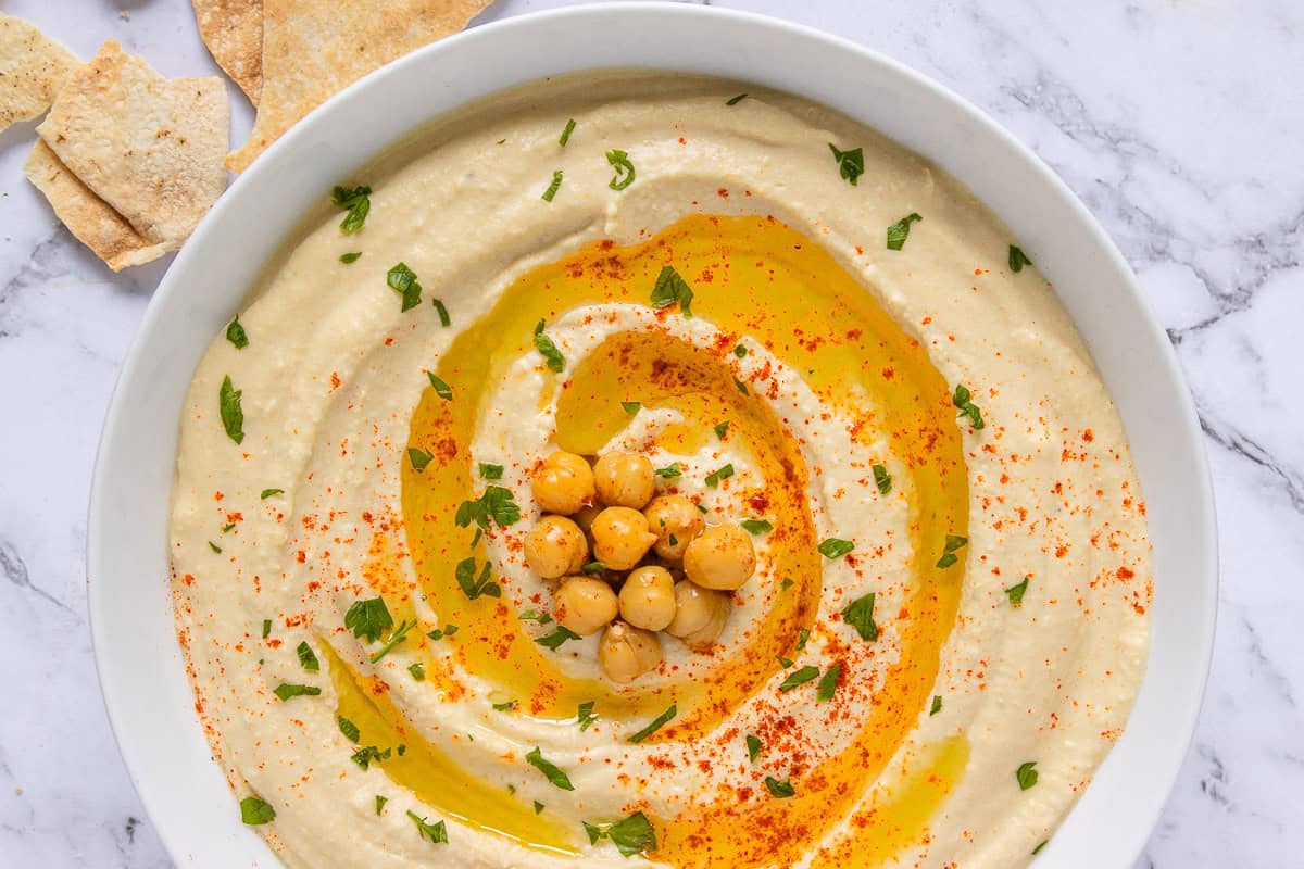 • Garnish - elevate your hummus with added garnish. Its very traditional to create a well or design using the back of a spoon. Some popular garnish ideas are extra chickpeas, smoked paprika, sumac, pine nuts, red pepper flakes or cayenne pepper, fresh parsley, and a good drizzle of extra virgin olive oilย