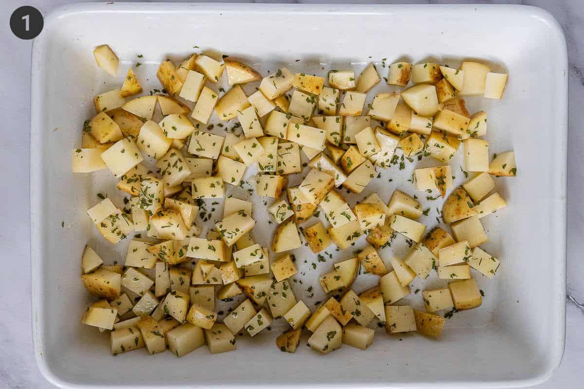 Step 1: Add diced potatoes to a baking dish (12x8 inch / 30x20 cm in size). Toss with olive oil, salt, pepper and rosemary. Roast for 20 mins in preheated oven of 400°F (200°C)