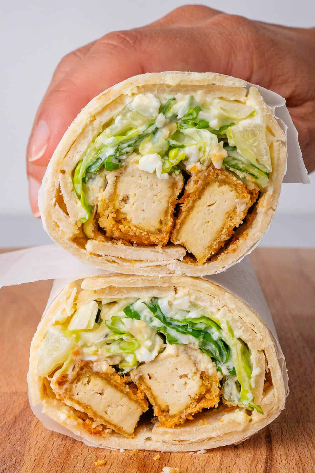 Here I've basically taken my caesar salad dressing recipe, to make this healthy caesar wrap. The dressing is deliciously creamy and acts like the sauce in the wrap. Now I know the traditional recipe that everyone is familiar with, are chicken caesar wraps...however I've swapped the chicken with crispy breaded tofu to keep it vegetarian that tastes just as good! The tofu is golden and crisp, and gives the wrap the perfect crunchy texture resembling croutons, however you can totally add chopped homemade croutons too. With a simple swap, you can easily also make it a vegan recipe.