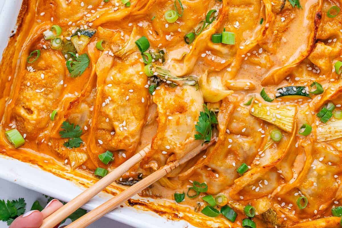This viral one pan Dumpling Bake is totally worth the hype! Using an easy dump and bake method, frozen dumplings are baked in a delicious creamy red curry broth for a cozy dinner. Serve with noodles or jasmine rice for a complete meal.