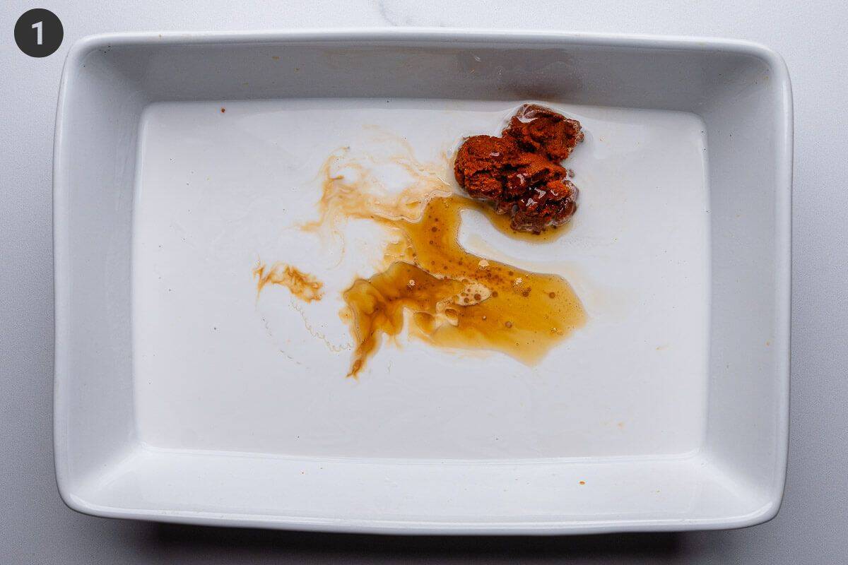 In a large baking dish (~ 12 x 8 inch / 30 x 20 cm), add coconut milk, red curry paste, soy sauce, vinegar, honey, and sesame oil. Whisk until smooth