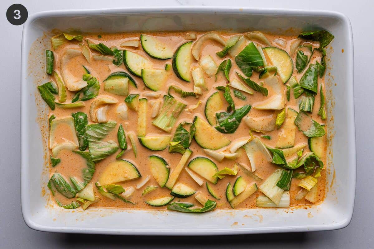Preheat oven to 400°F (200°C). Chop bok choy and slice zucchini, then stir them into the curry mixture