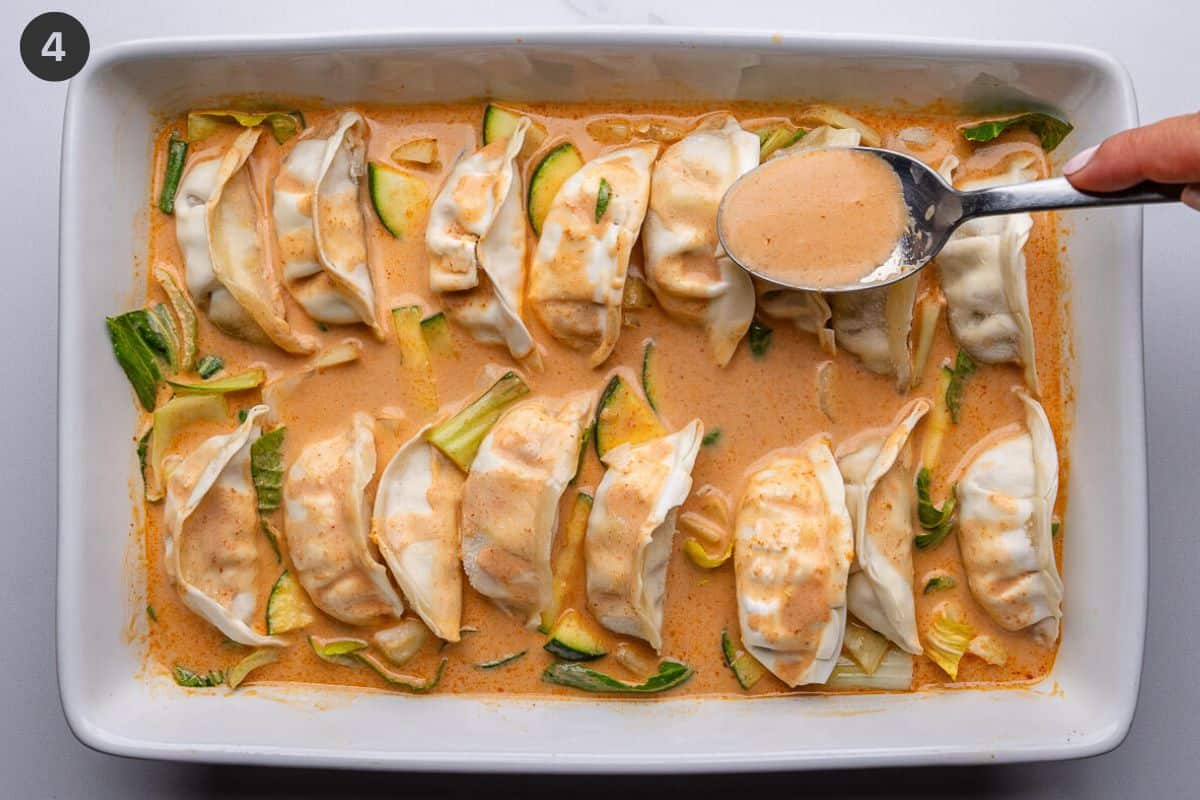 This viral dumpling bake comes together with just a few simple steps and one baking dish. Follow my instructions below (note quantities are listed in the recipe card below)