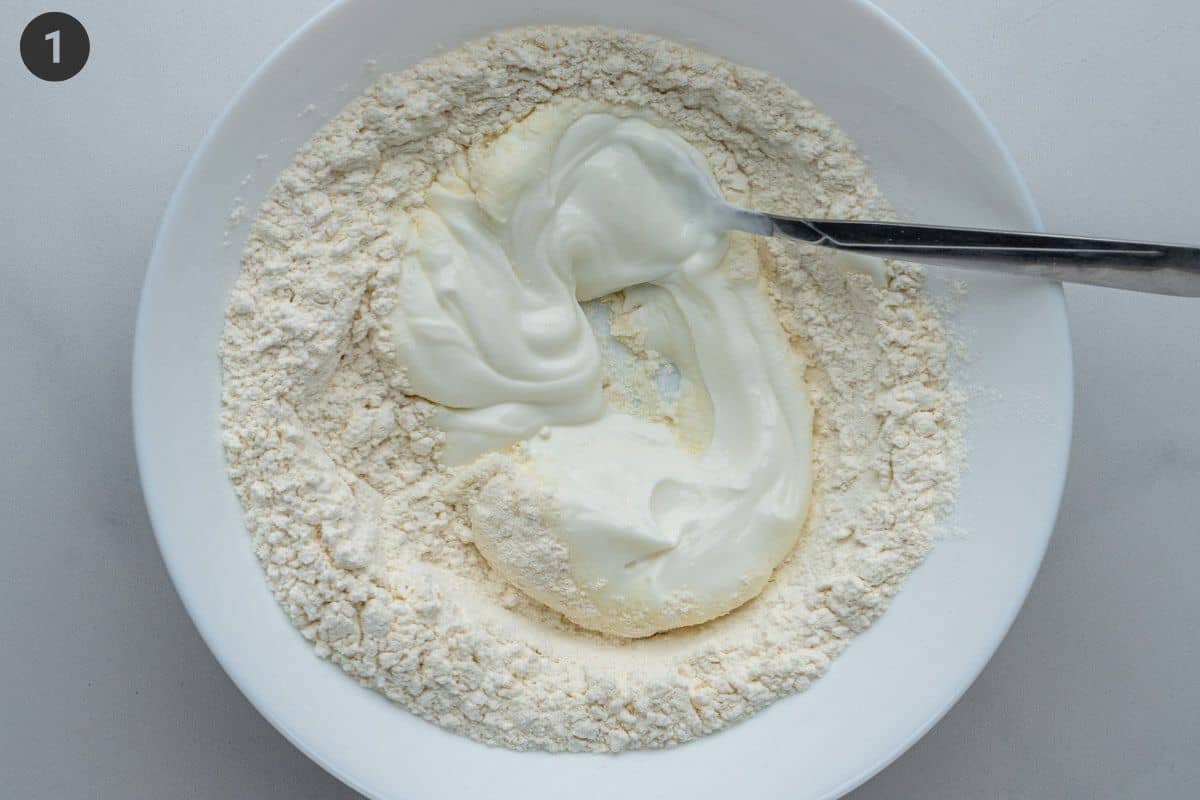 - Add flour, salt, and yogurt to a large bowl. *Add baking powder if using AP flour. Mixing with a spoon or one hand to form a rough ball