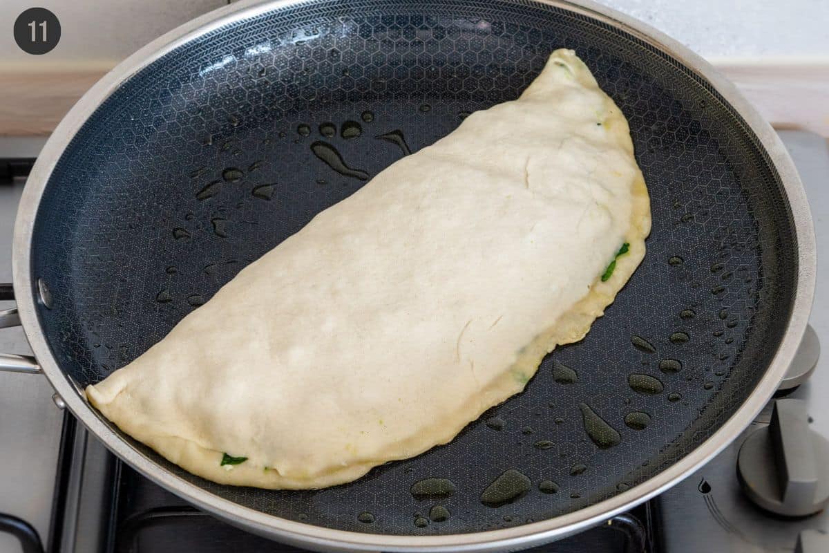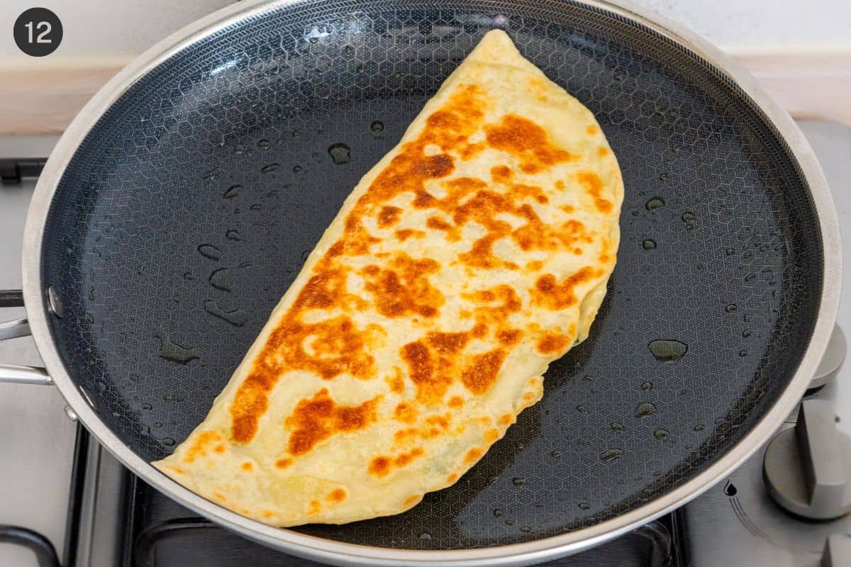 - Heat a large pan over medium heat with 2 teaspoon olive oil. Place a gozleme in the pan and cook for 3-5 minutes until golden