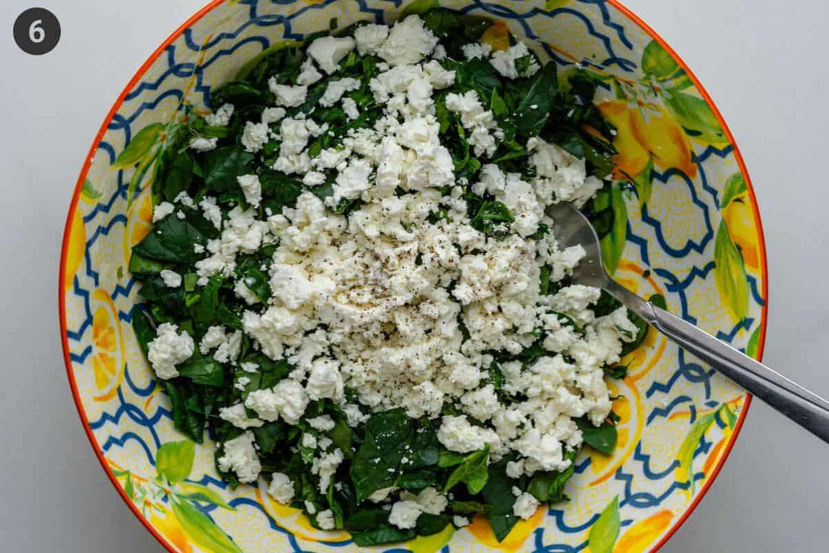 - Add chopped spinach to a bowl and scrunch with your hands to soften. Then crumble in the feta cheese, add salt and pepper, and stir together