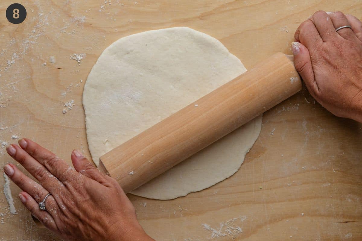 - Try and roll the dough as thin as you can without it tearing. Add flour as you go and keep flipping it upside down