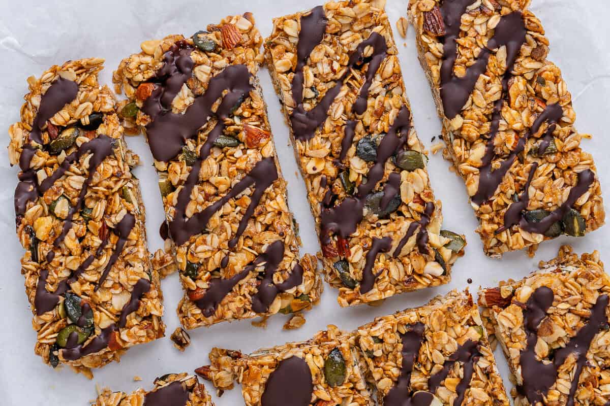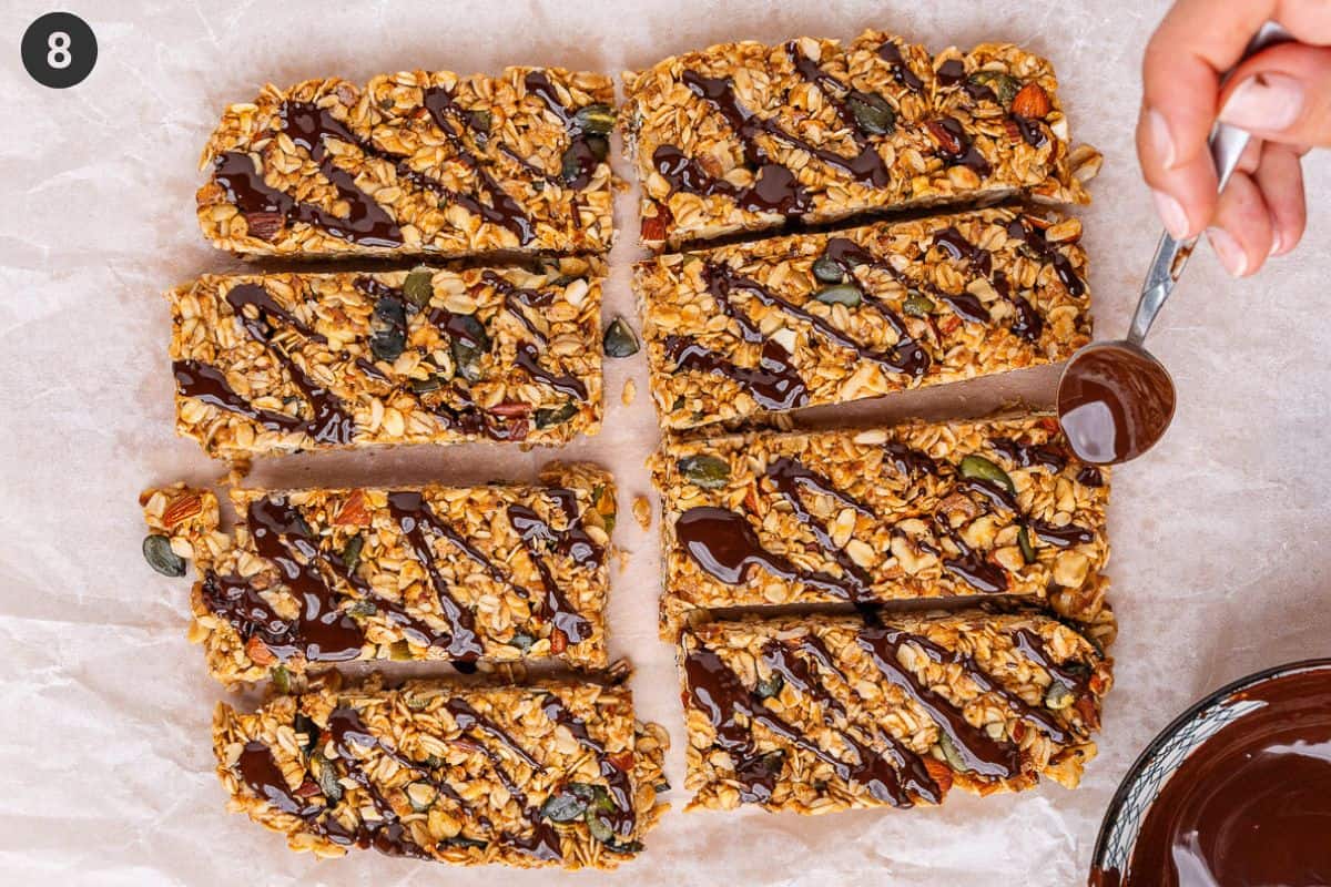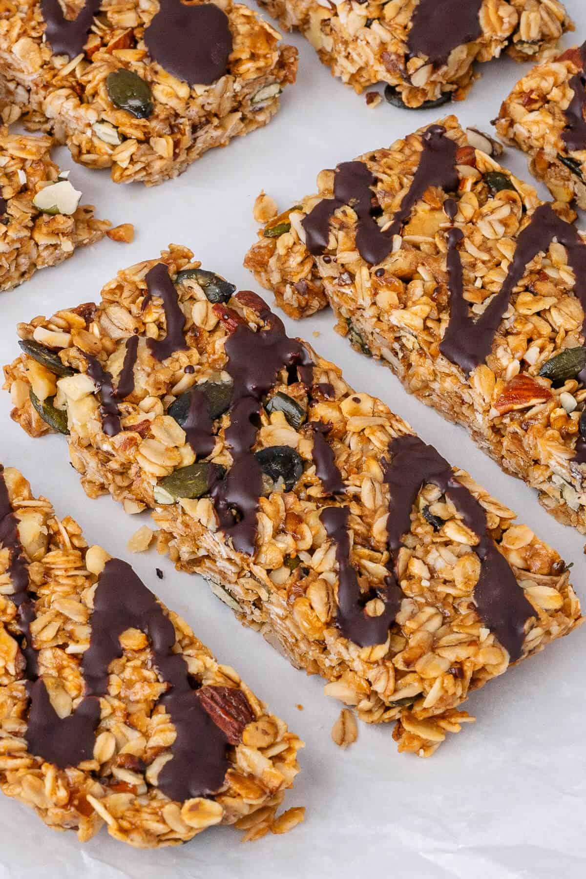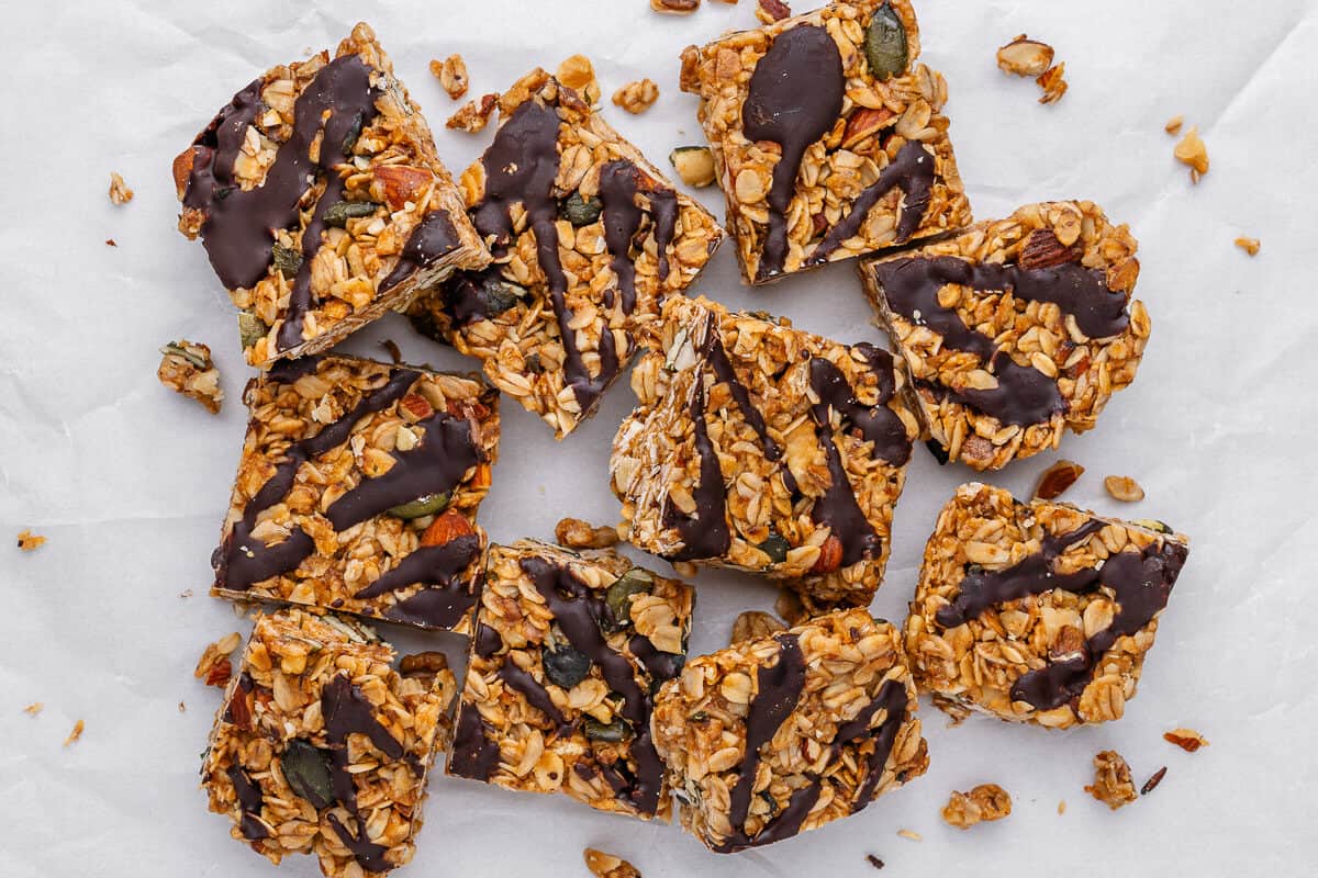 - If adding the chocolate drizzle, melt the chocolate in the microwave or using a double boiler method. Drizzle over the tops of the granola bars and place back in the fridge to setStore in the fridge or freezer and enjoy your Healthy Homemade Granola Bars!