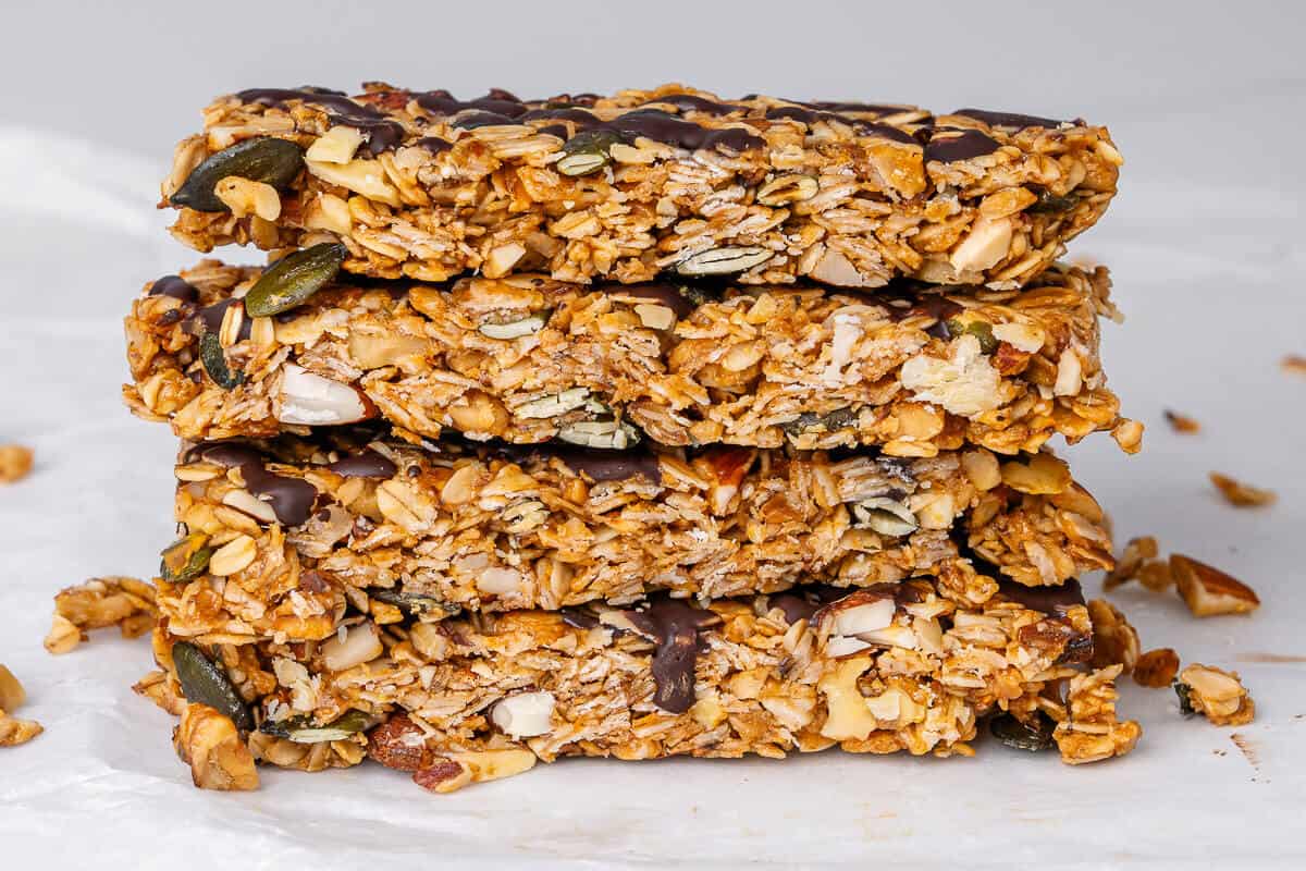 These homemade Granola Bars taste that good you won't believe they're healthy! I've always loved granola bars and used to take them to school and work. Unfortunately though, so many store-bought bars are full of sugar, oils and preservatives, making them more like candy bars. It wasn't until I was in my 20โs where I started reading labels properly and couldn't believe what was in them, so I stopped buying them completely. Here my granola bar recipe is delicious and nutritious with a balance of protein, fiber, and healthy fats.