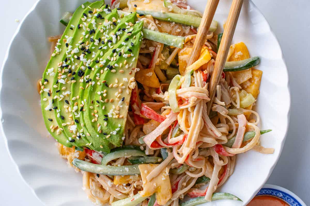 This Kani Salad is a Japanese crab salad that is light and refreshing. Made with strips of imitation crab, cucumbers, avocado and mango in a creamy spicy mayo dressing yum! It's essentially a kani sushi roll made into a delicious salad.
