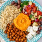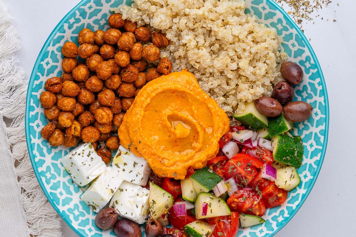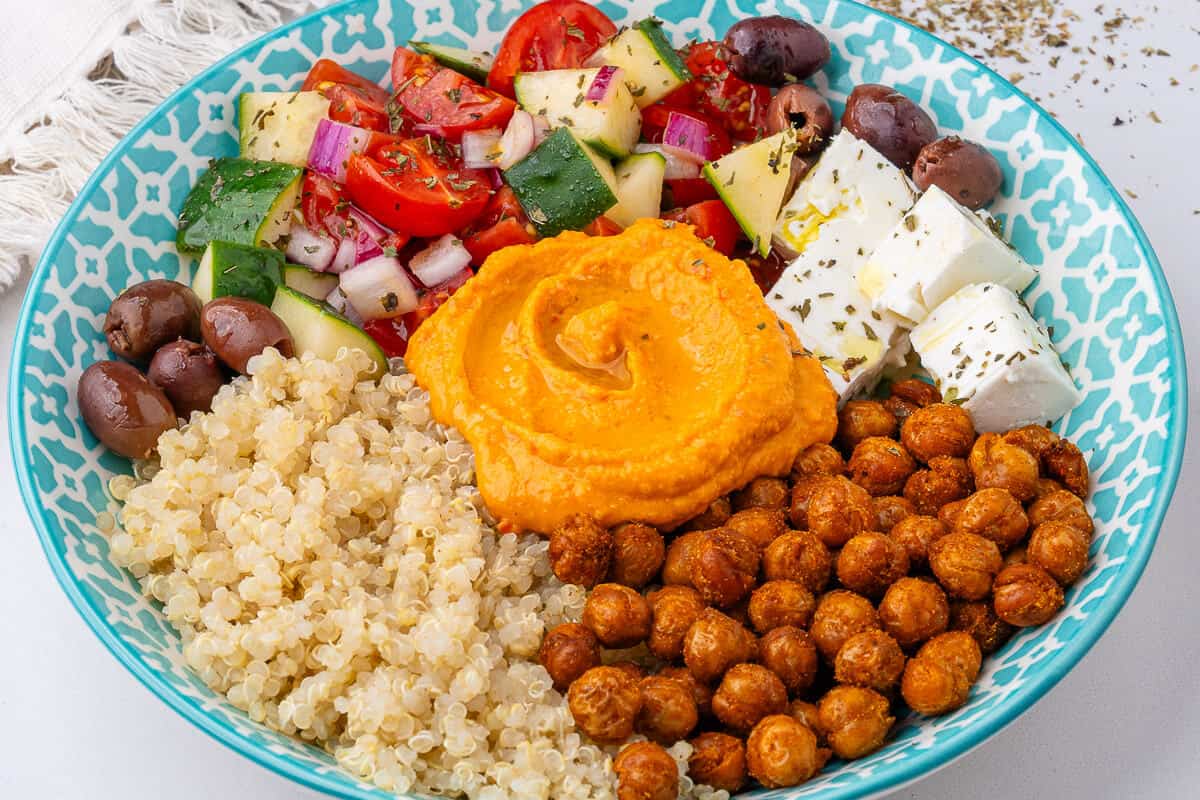 Mediterranean Bowl with red pepper hummus, roasted chickpeas, salad, feta and quinoa