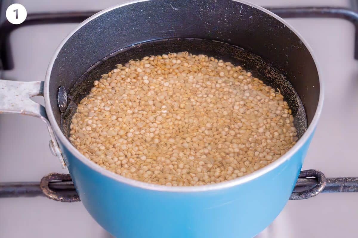 • Rinse quinoa and add to a small pot with โ…” cups of water and a pinch of salt. Simmer over medium heat with the lid off for approximately 15 minutes until most of the water is absorbed
