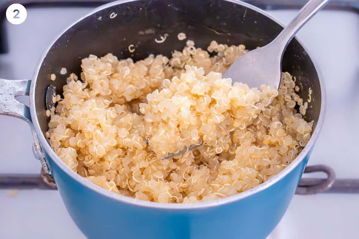 • Turn the heat off and place on the lid and let it stand covered for 5 minutes. Then remove the lid and fluff the quinoa with a fork - more detailed quinoa recipe here