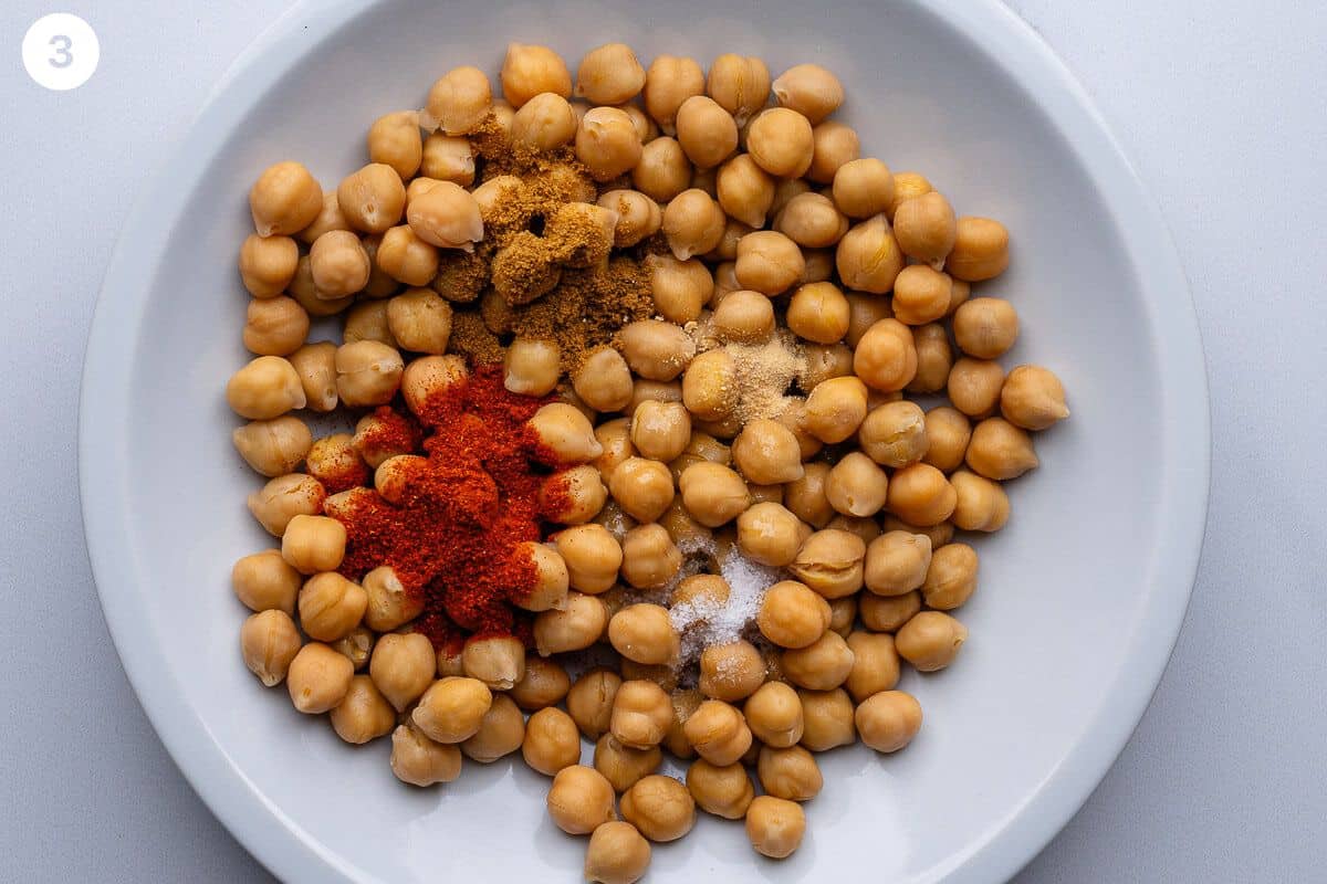 For crispy chickpeas, pat them dry, then toss with oil and seasonings in a bowl