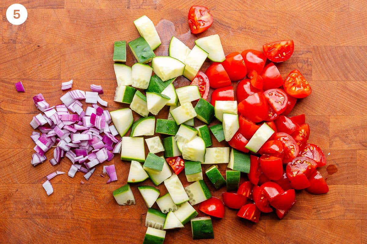 Make the salad by chopping cucumber and tomatoes, finely dicing red onion