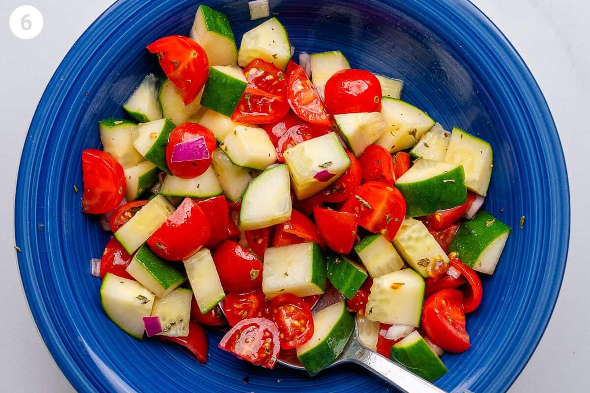 • Make the salad by chopping the cucumber and tomatoes into bite sized pieces and finely dicing the red onion. Add to a bowl with the dressing and stir to combine
