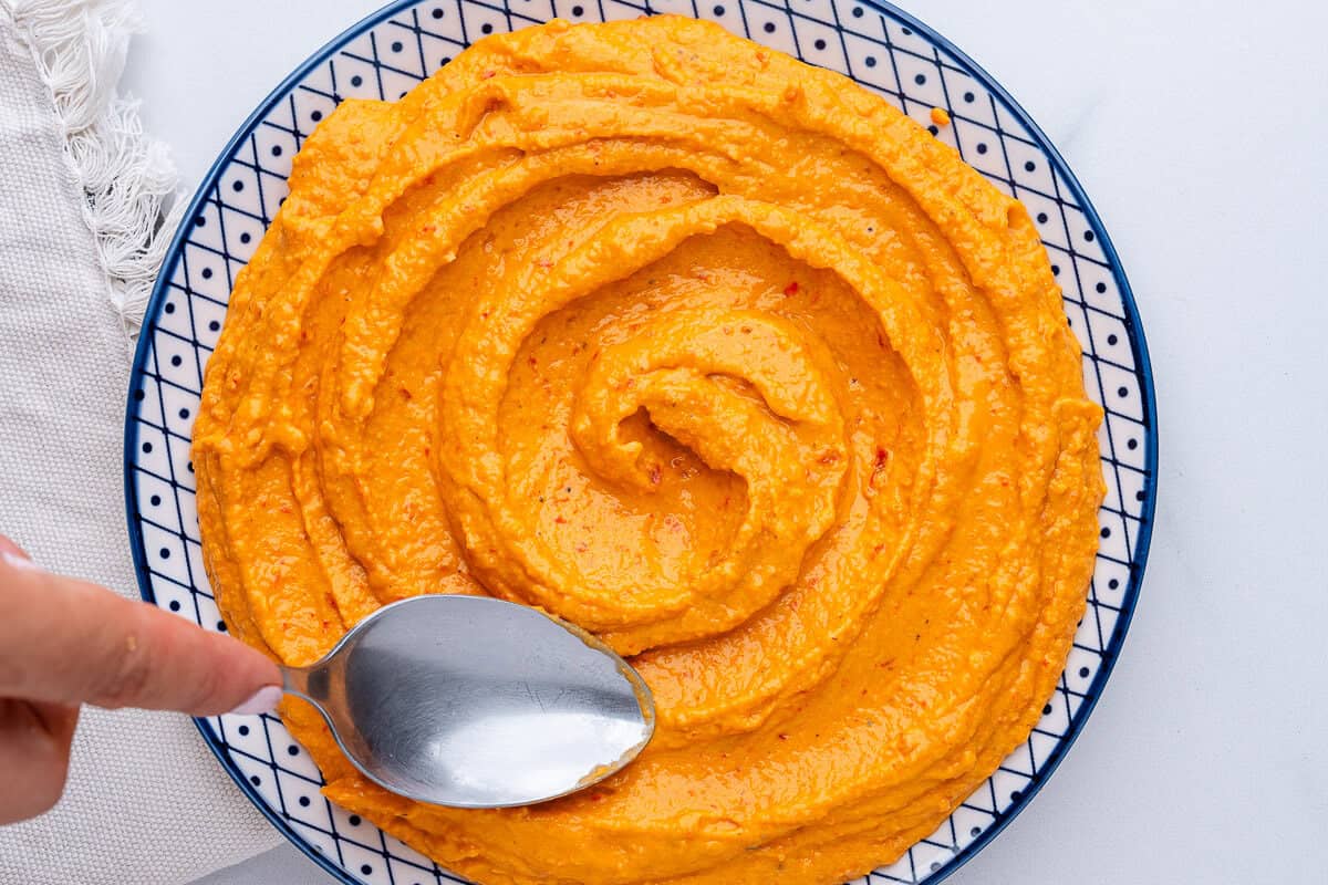 Using back of spoon to make a swirl design on roasted red pepper hummus