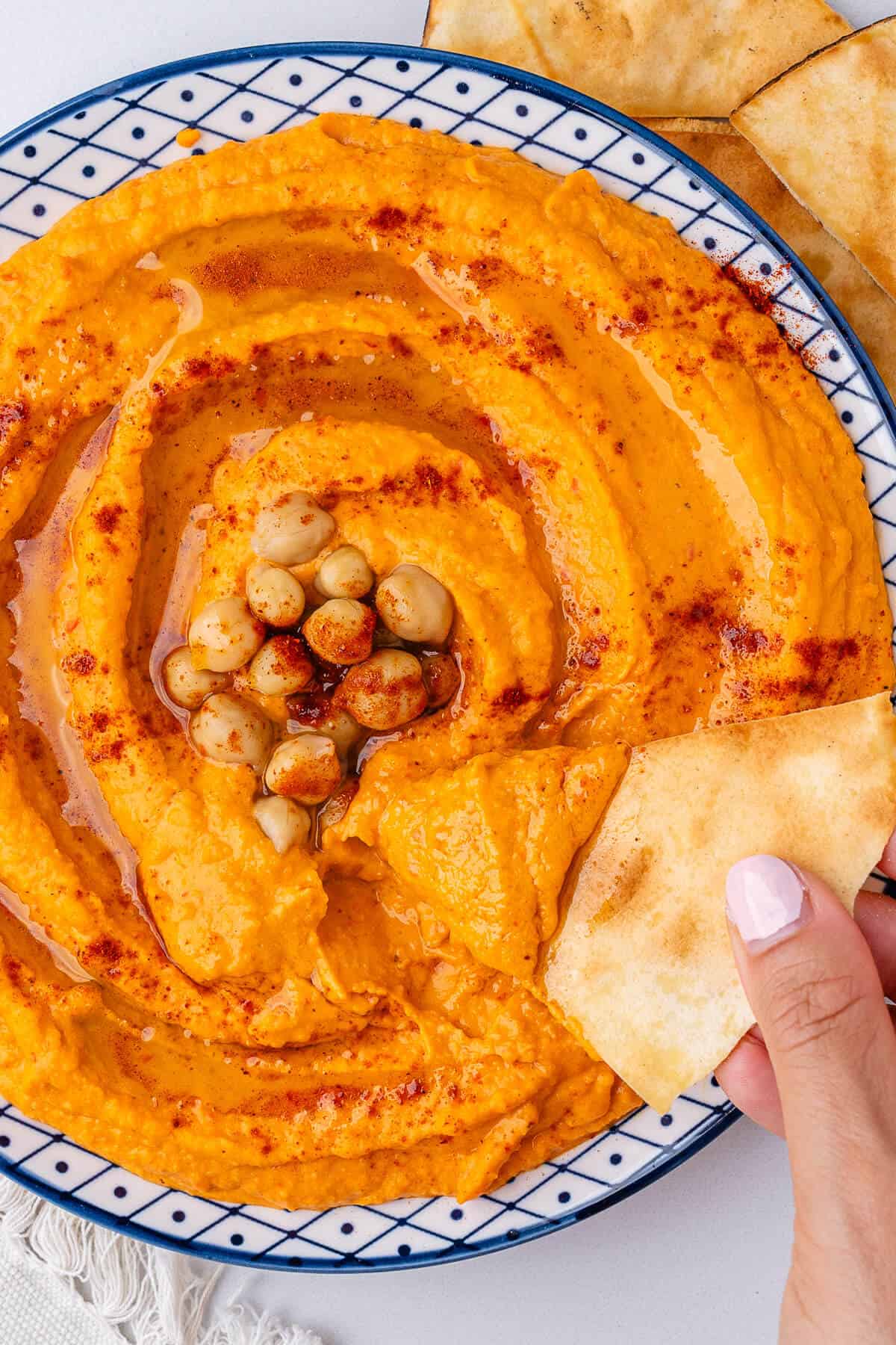 Pita chip being dipped into a bowl of roasted red pepper hummus