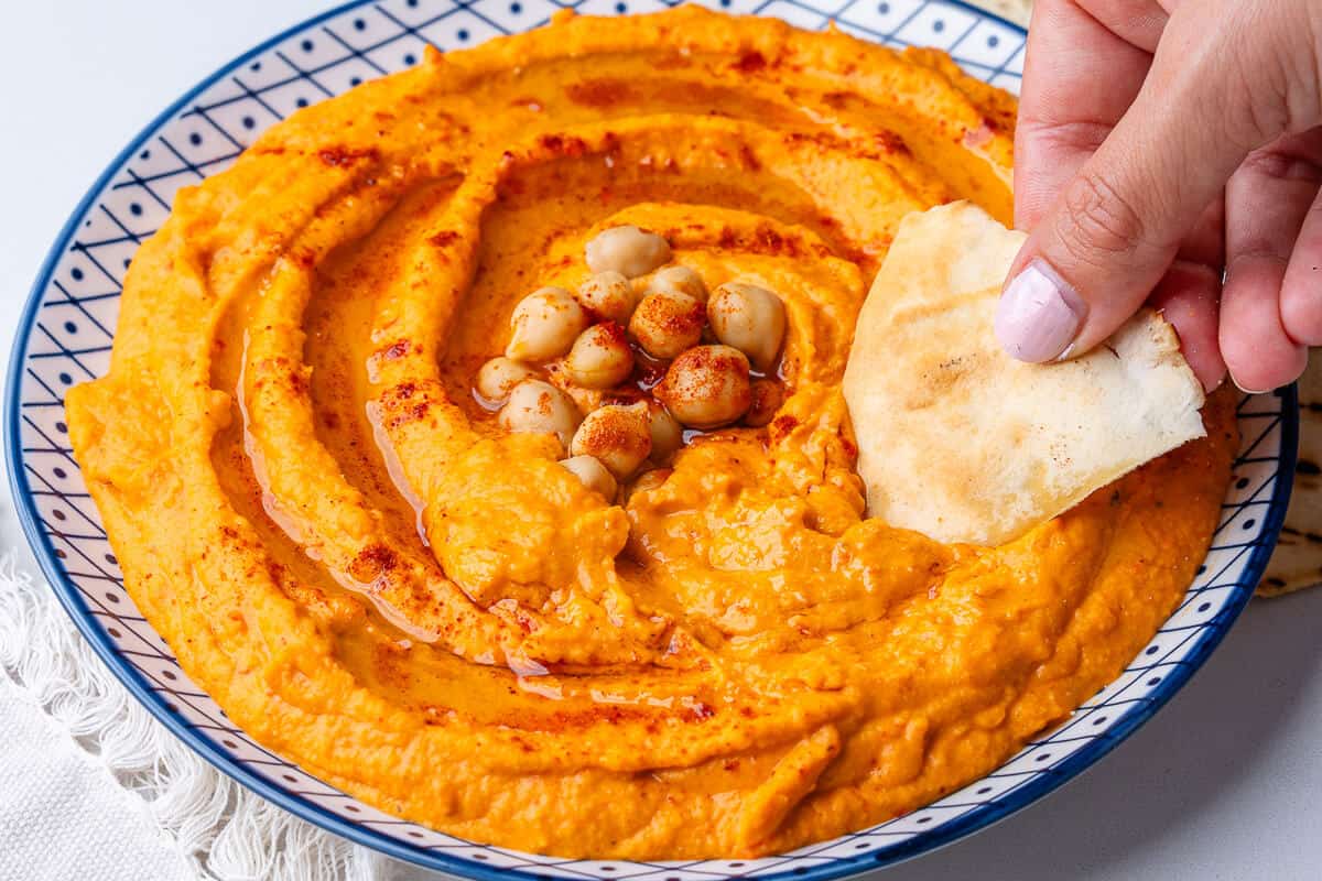 Pita chip being dipped into a bowl of roasted red pepper hummus