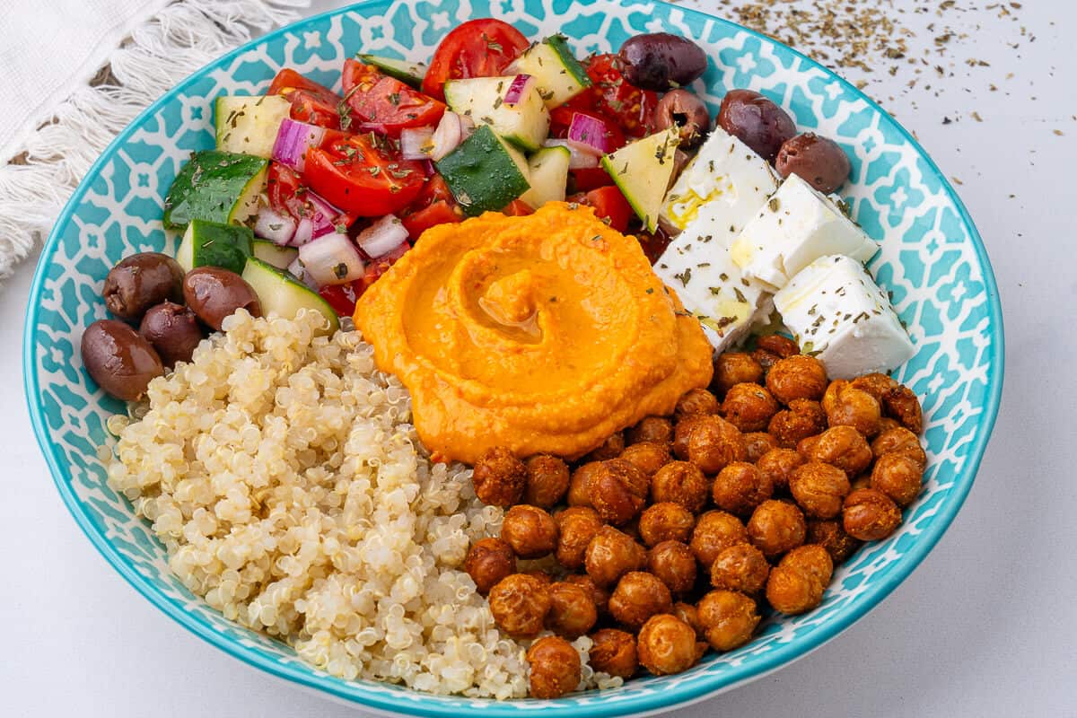 Mediterranean bowl with roasted red pepper hummus, quinoa, chickpeas, salad and feta