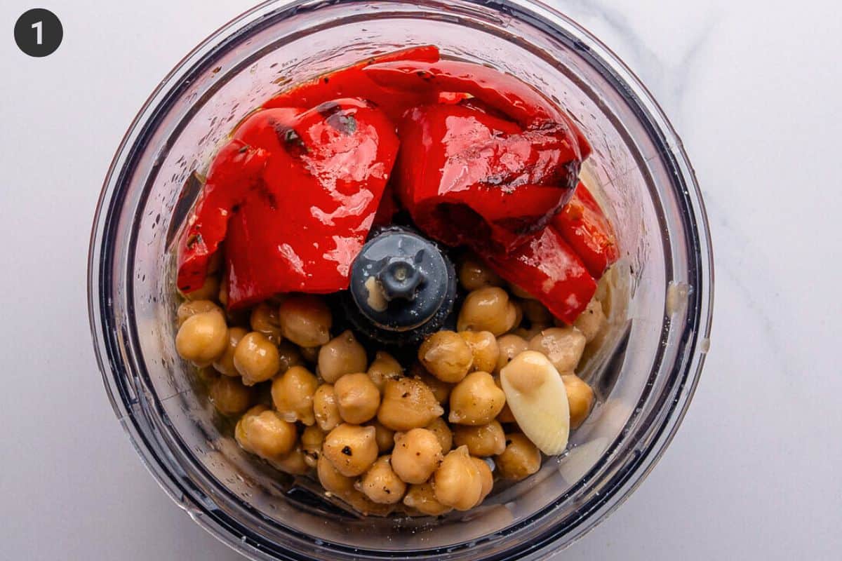 • Drain the roasted red peppers and chickpeas and add them to a food processor or blender with the garlic, tahini, lemon juice, a good pinch of salt and pepper, and 2 tablespoons of the chickpea water from the can