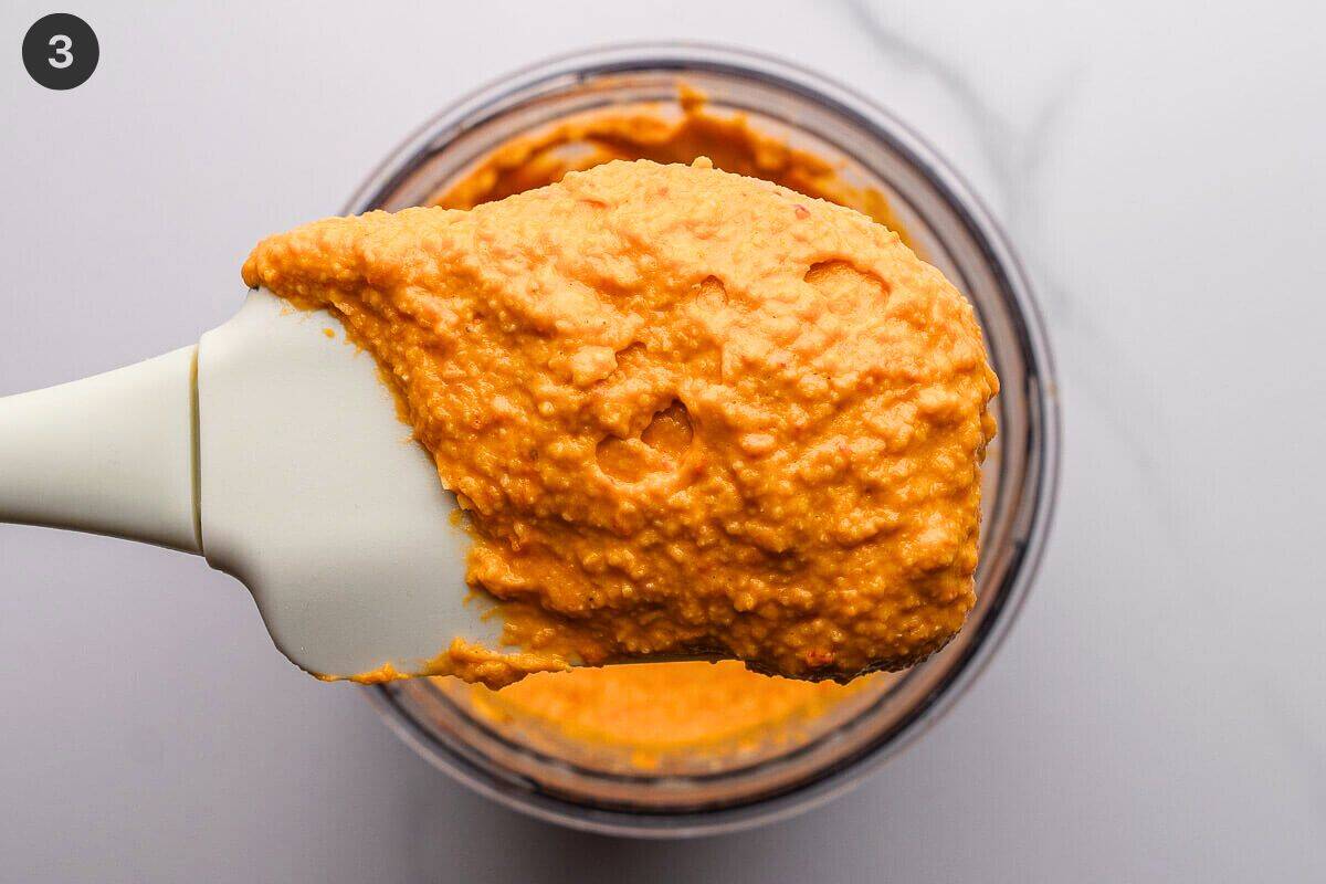 • Blend until smooth consistency, stopping half way to push the mixture down on the sides with a spatula, and give it a little taste for seasoning