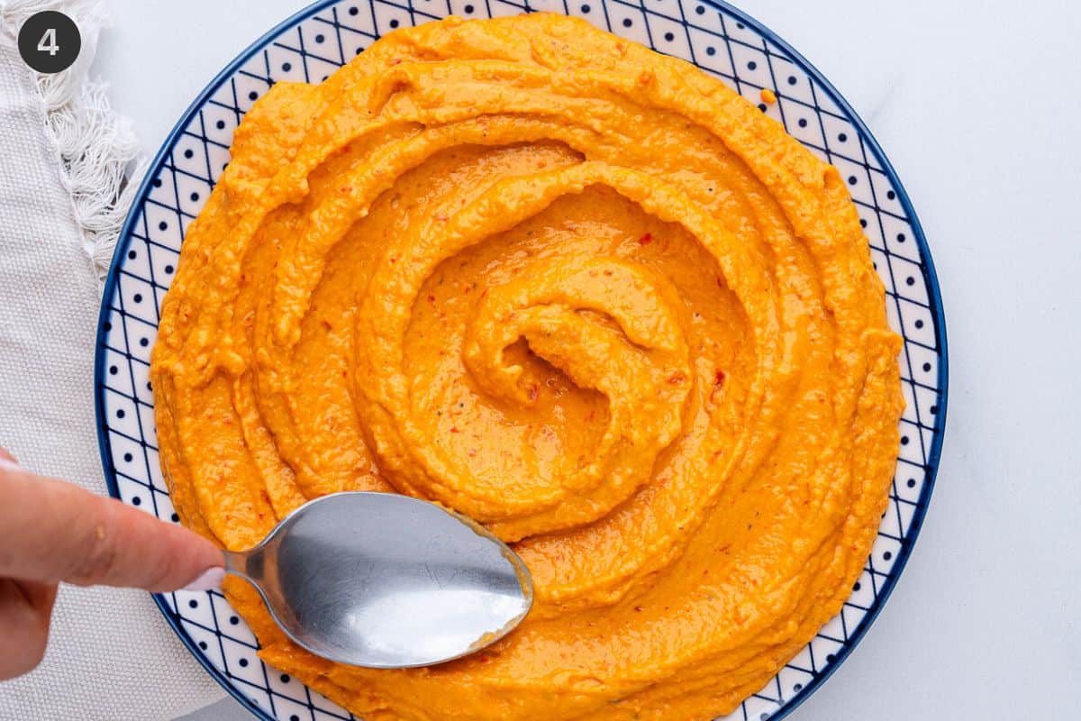 Using back of spoon to make a swirl design on roasted red pepper hummus