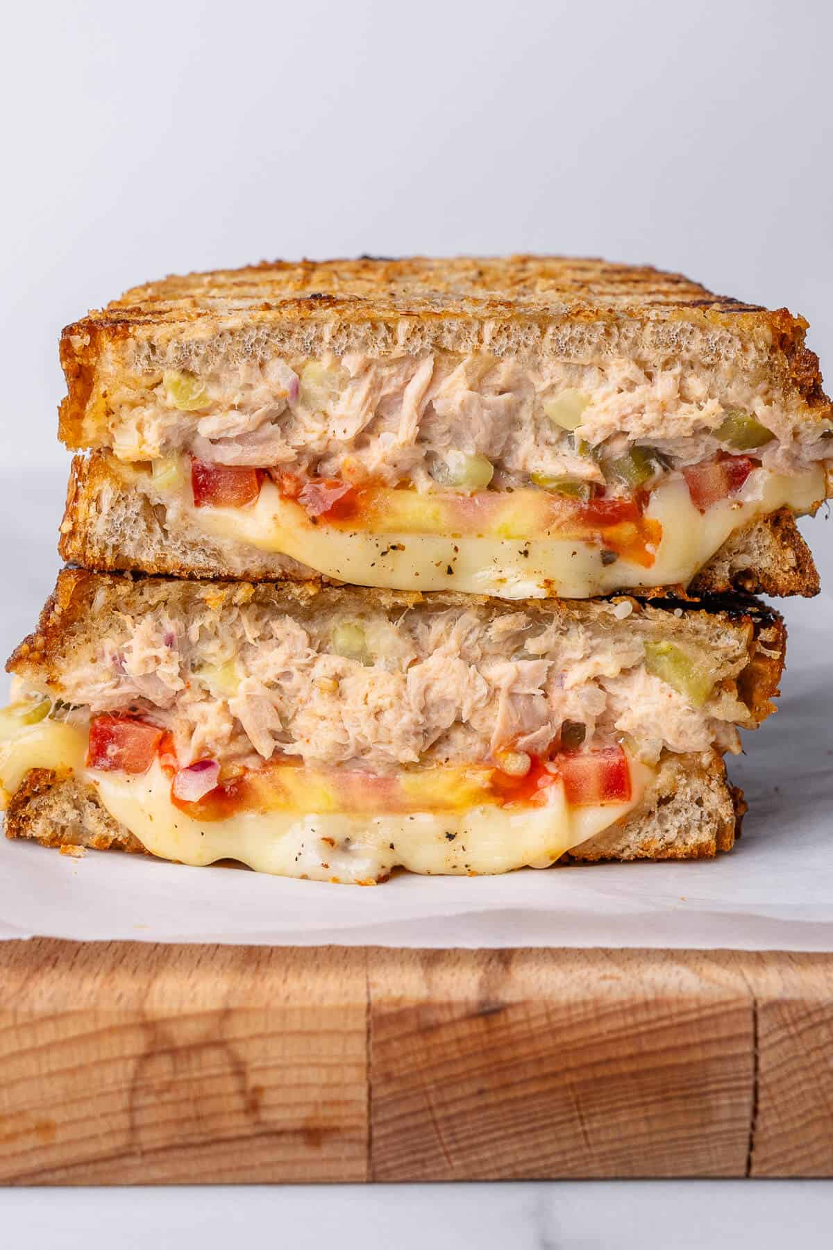 This cheesy Tuna Melt is crazy delicious and a classic for a reason. Here I've made a lighter tuna salad that's creamy and tangy, sandwiched with tomato and cheese for the ultimate comfort food. You can also use my chickpea tuna for a veggie version.