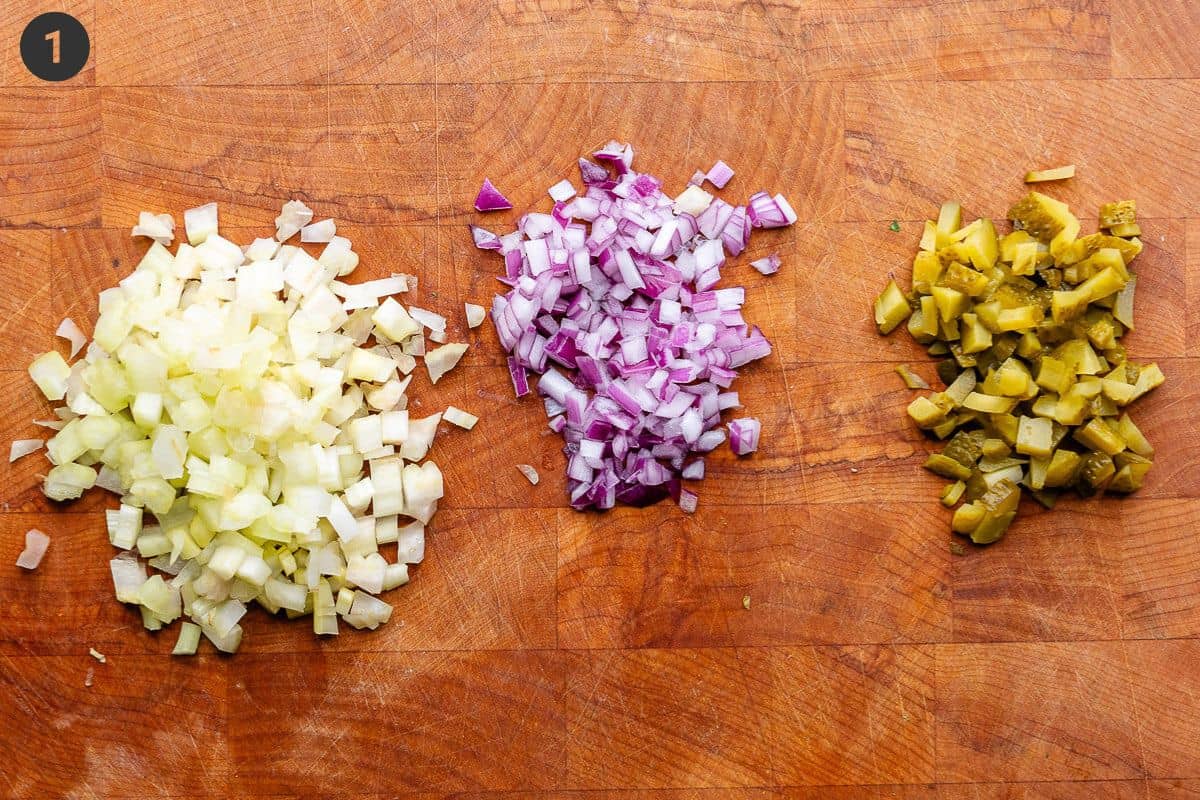 - Finely dice the pickle, celery and red onion. *Optional, soak the onion in a bowl of water while prepping the rest to remove the harsh onion flavor