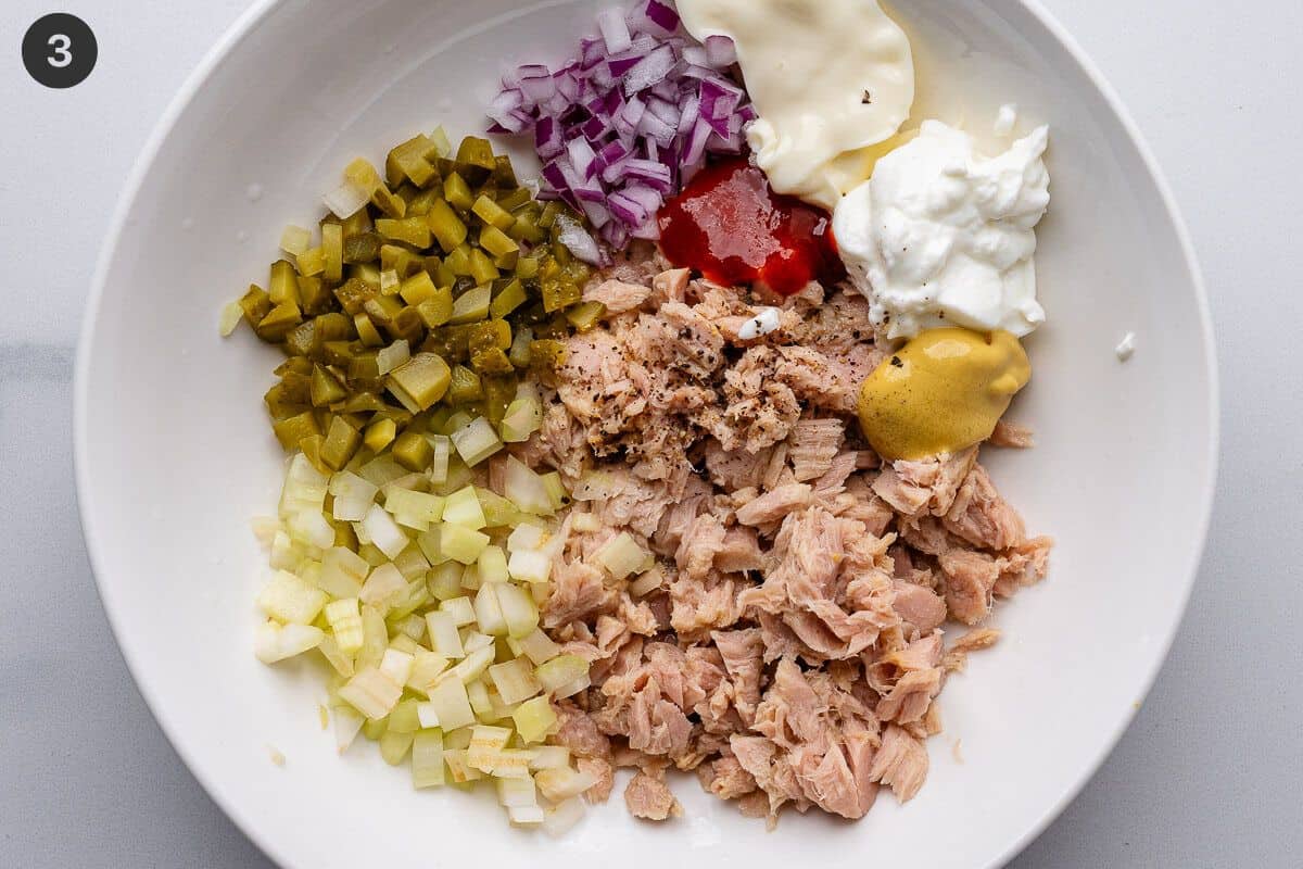 - Pickles, celery, red onion are all finely diced adding a little crunch, zing, and freshness. You can substitute with capers, green onions or shallots too