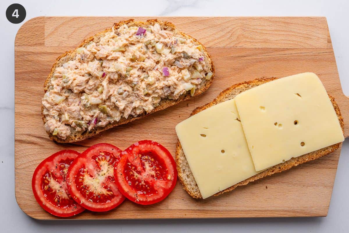 - Add the cheese to the bottom bread slices, top with the tomatoes and season with salt and pepper. Spoon on the tuna salad mixture and place over the top slice of bread